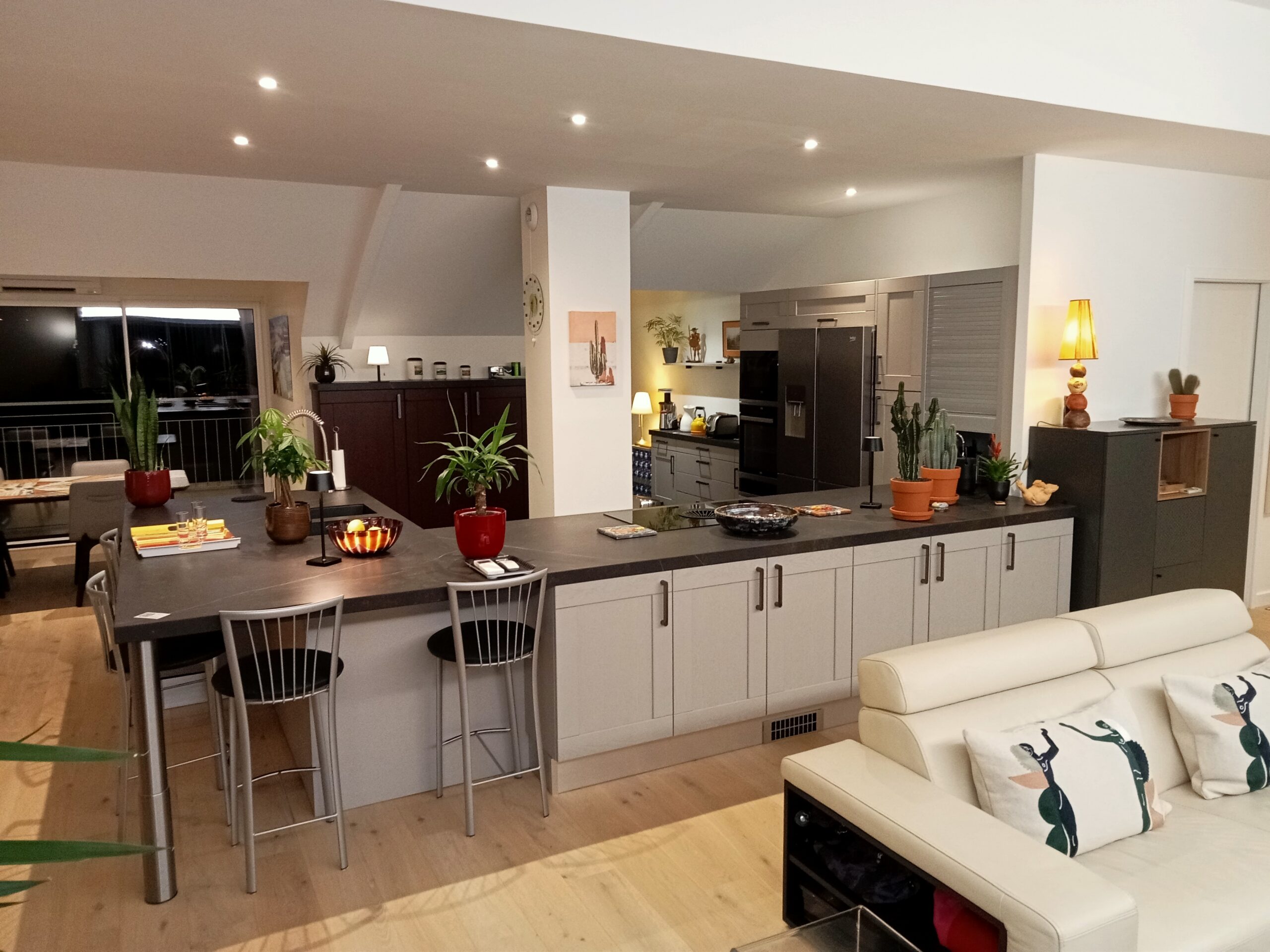 Nos cuisines associent esthétique et praticité : îlots centraux, façades sans poignées, éclairages LED, solutions gain de place.